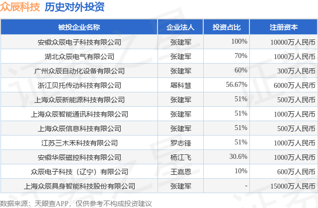 证券之星消息,根据天眼查APP显示,众辰科技(603275.SH)新增一起对外投资事件,被投资公司为上海众辰具身智能科技股份有限公司,法定代表人张建军,投资占比为-。该公司从事科技推广和应用服务业,注册资本为15000万人民币。目前,众辰科技共存在对外投资11项,详见下表: