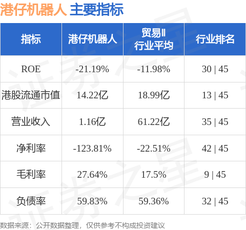 港仔机器人港股市值14.22亿港元,在贸易Ⅱ行业中排名第13。主要指标见下表: