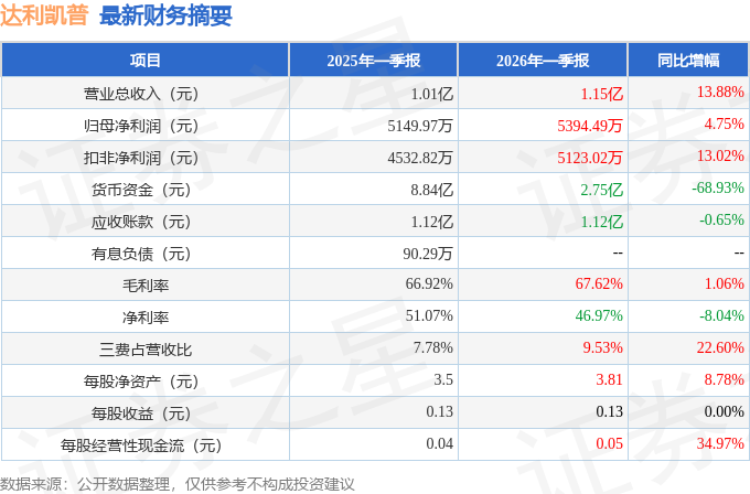 据证券之星公开数据整理,近期达利凯普(301566)发布2026年一季报。截至本报告期末,公司营业总收入1.15亿元,同比上升13.88%,归母净利润5394.49万元,同比上升4.75%。按单季度数据看,第一季度营业总收入1.15亿元,同比上升13.88%,第一季度归母净利润5394.49万元,同比上升4.75%。本报告期达利凯普公司应收账款体量较大,当期应收账款占最新年报归母净利润比达70.11%。