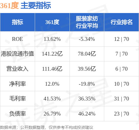 361度港股市值141.22亿港元,在服装家纺行业中排名第7。主要指标见下表: