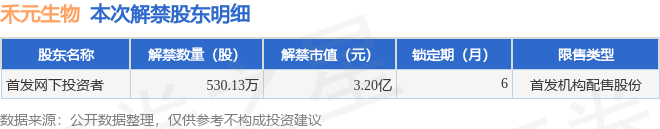 证券之星消息,根据市场公开信息整理,禾元生物(688765)于4月28日将有530.13万股限售股份解禁,为公司首发机构配售股份,占公司总股本1.48%。(本次数据根据历史公告整理得出,实际情况以上市公司最新公告为准)本次解禁后,公司还有3.11亿股限售股份,占总股本87.05%。具体如下图所示: