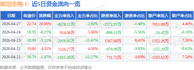 证券之星消息,截至2026年4月27日收盘,前沿生物(688221)报收于22.74元,上涨20.0%,涨停,换手率18.92%,成交量70.88万手,成交额16.03亿元。