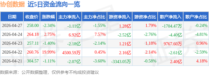 证券之星消息,截至2026年4月27日收盘,协创数据(300857)报收于258.0元,下跌2.34%,换手率5.77%,成交量27.81万手,成交额71.92亿元。