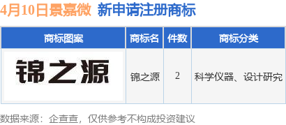 证券之星消息,根据天眼查APP数据显示,近日长沙景嘉微电子股份有限公司新提交“锦之源”等2件商标注册申请。商标申请详情如下: