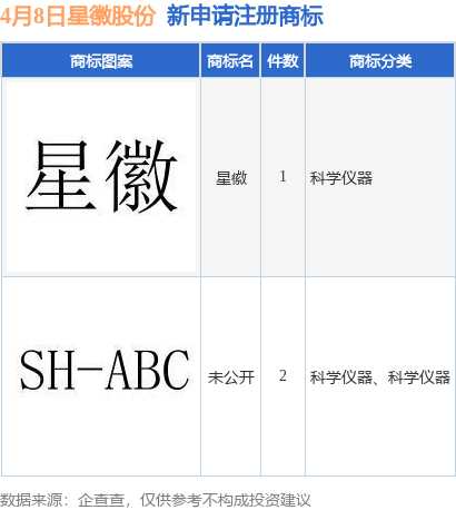 证券之星消息,根据天眼查APP数据显示,近日广东星徽精密制造股份有限公司新提交“未公开”、“星徽”等3件商标注册申请。商标申请详情如下: