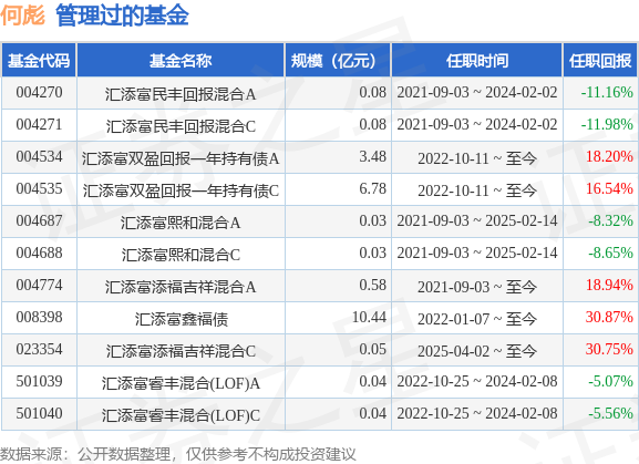何彪先生:中国,CPA、CFA,研究生学历、硕士学位。2014年加入汇添富基金管理股份有限公司,历任固定收益助理分析师、固定收益分析师、固定收益高级分析师及专户投资经理等。2021年09月03日担任汇添富添福吉祥混合型证券投资基金基金经理。2021年09月03日担任汇添富熙和精选混合型证券投资基金基金经理、汇添富民丰回报混合型证券投资基金基金经理。2022年1月7日起任汇添富鑫福债券型证券投资基金的基金经理。2022年10月11日至今任汇添富双盈回报一年持有期债券型证券投资基金的基金经理。2022年10月25日起任汇添富睿丰混合型证券投资基金(LOF)基金经理。