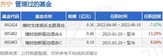 齐宁先生:中国国籍,研究生硕士,1999-2003中国移动项目经理,2005-2010中国电信业务主管,2010-2015中投证券研究员,2015-至今博时基金历任高级研究员、高级研究员兼基金经理助理、资深研究员兼基金经理助理、资深研究员兼投资经理。2021年1月29日起担任博时创新驱动灵活配置混合型证券投资基金的基金经理。2022年4月6日起担任时文体娱乐主题混合型证券投资基金的基金经理。