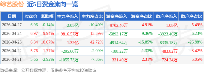 4月27日的资金流向数据方面,主力资金净流出2.05亿元,占总成交额10.4%,游资资金净流入9702.4万元,占总成交额4.91%,散户资金净流入1.08亿元,占总成交额5.49%。