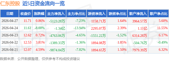 4月27日的资金流向数据方面,主力资金净流出5123.28万元,占总成交额7.23%,游资资金净流入1158.71万元,占总成交额1.64%,散户资金净流入3964.57万元,占总成交额5.6%。