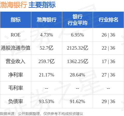 渤海银行港股市值52.7亿港元,在银行行业中排名第22。主要指标见下表: