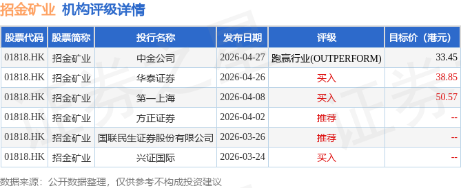 投行对该股的评级以买入为主,近90天内共有3家投行给出买入评级,近90天的目标均价为40.96港元。中金公司最新一份研报给予招金矿业跑赢行业(OUTPERFORM)评级,目标价33.45港元。