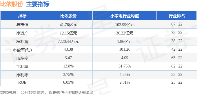 比依股份主要指标及行业内排名如下: