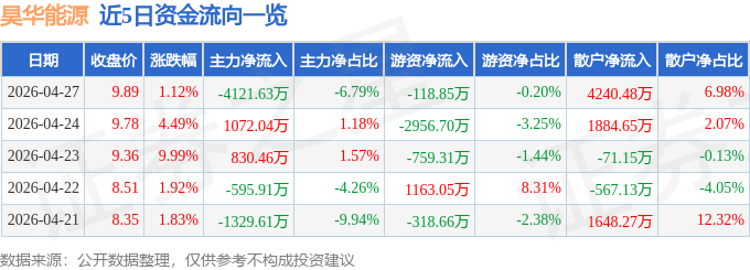4月27日的资金流向数据方面,主力资金净流出4121.63万元,占总成交额6.79%,游资资金净流出118.85万元,占总成交额0.2%,散户资金净流入4240.48万元,占总成交额6.98%。