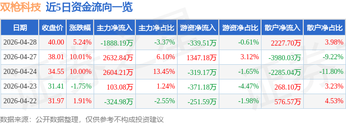 证券之星消息,截至2026年4月28日收盘,双枪科技(001211)报收于40.0元,上涨5.24%,换手率21.17%,成交量14.18万手,成交额5.6亿元。