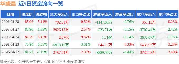 证券之星消息,截至2026年4月28日收盘,华盛昌(002980)报收于85.06元,上涨5.14%,换手率18.04%,成交量18.28万手,成交额15.12亿元。