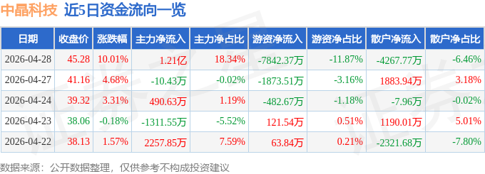 证券之星消息,中晶科技4月28日涨停收盘,收盘价45.28元。该股于10点0分涨停,未打开涨停,截止收盘封单资金为9683.1万元,占其流通市值2.23%。