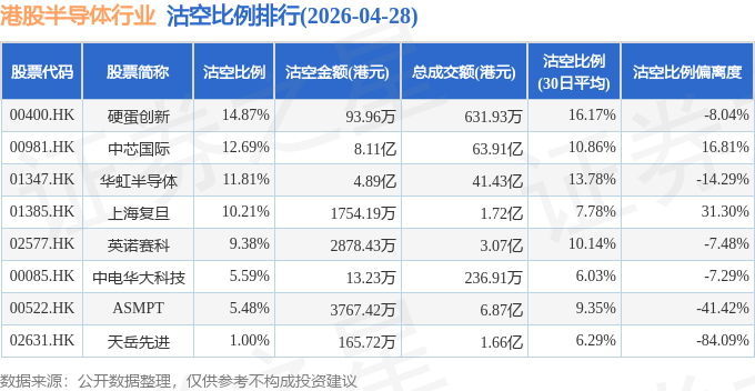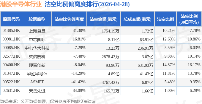 从沽空比例偏离度来看,上海复旦、中芯国际、中电华大科技沽空比例偏离度位居行业前三,分别为31.3%、16.81%、-7.29%。