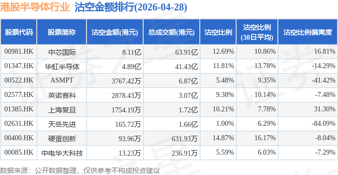 从沽空金额来看,中芯国际、华虹半导体、ASMPT沽空金额位居行业前三,分别为8.11亿港元、4.89亿港元、3767.42万港元。