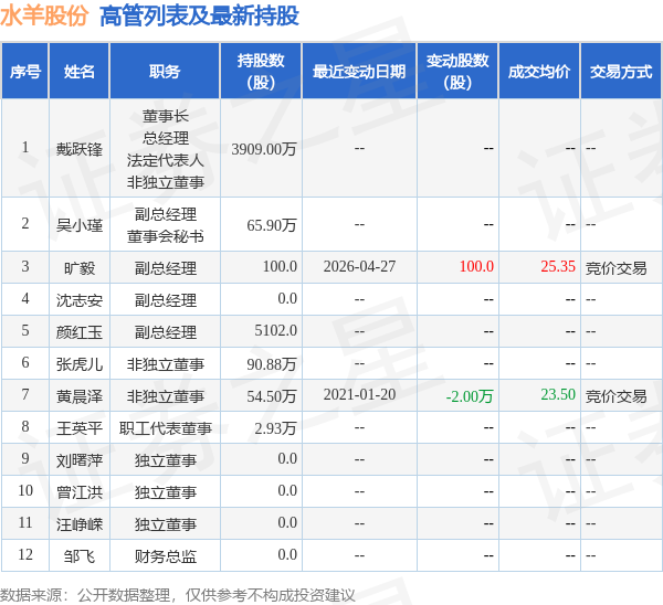 水羊股份的高管列表及最新持股情况如下: