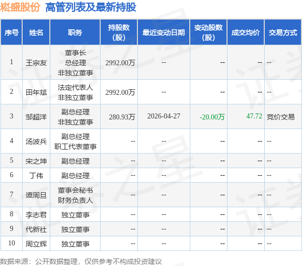 崧盛股份的高管列表及最新持股情况如下:
