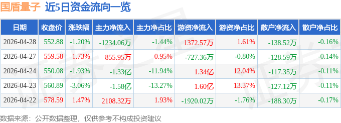 证券之星消息,截至2026年4月28日收盘,国盾量子(688027)报收于552.88元,下跌1.2%,换手率1.91%,成交量1.53万手,成交额8.55亿元。