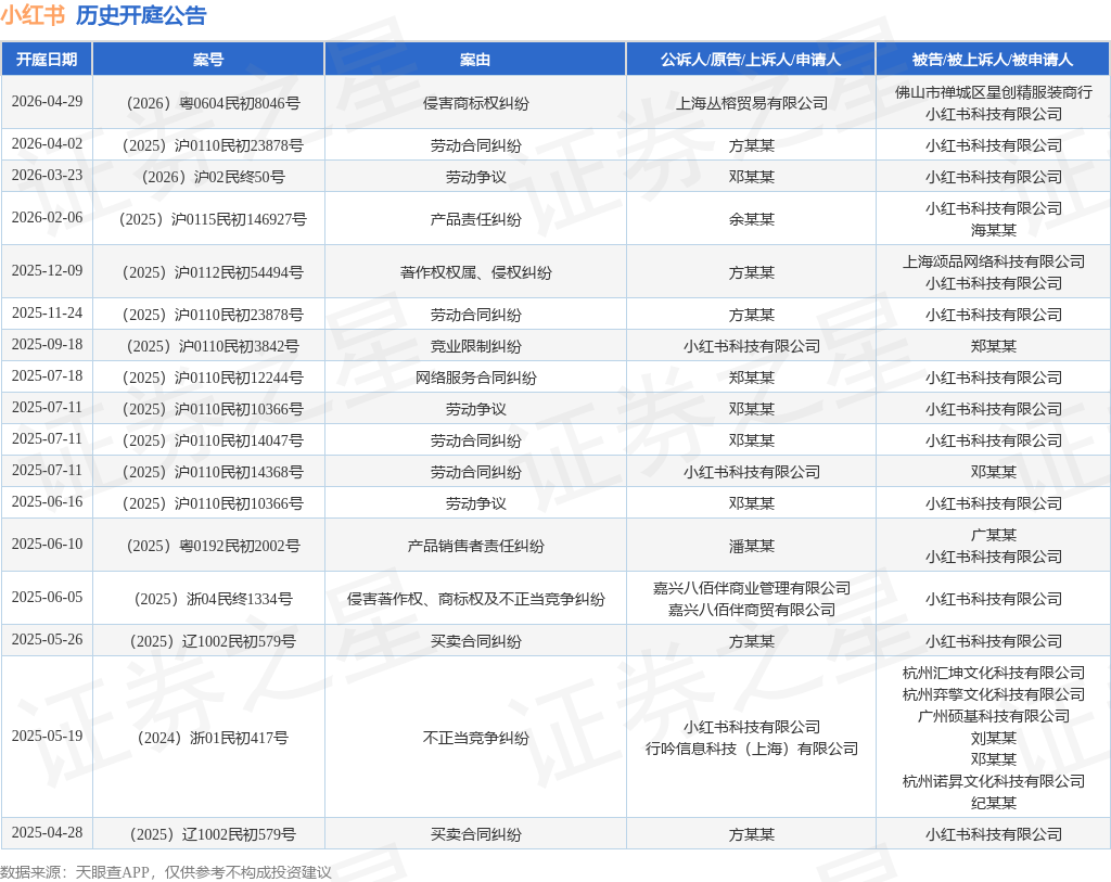 案号:(2026)粤0604民初8046号根据统计,近一年内以小红书科技有限公司为当事人的历史开庭公告有17则,其中案由为“劳动合同纠纷”的公告以4则居首,其次为“劳动争议”有3则,“买卖合同纠纷”有2则。历史开庭公告如下: