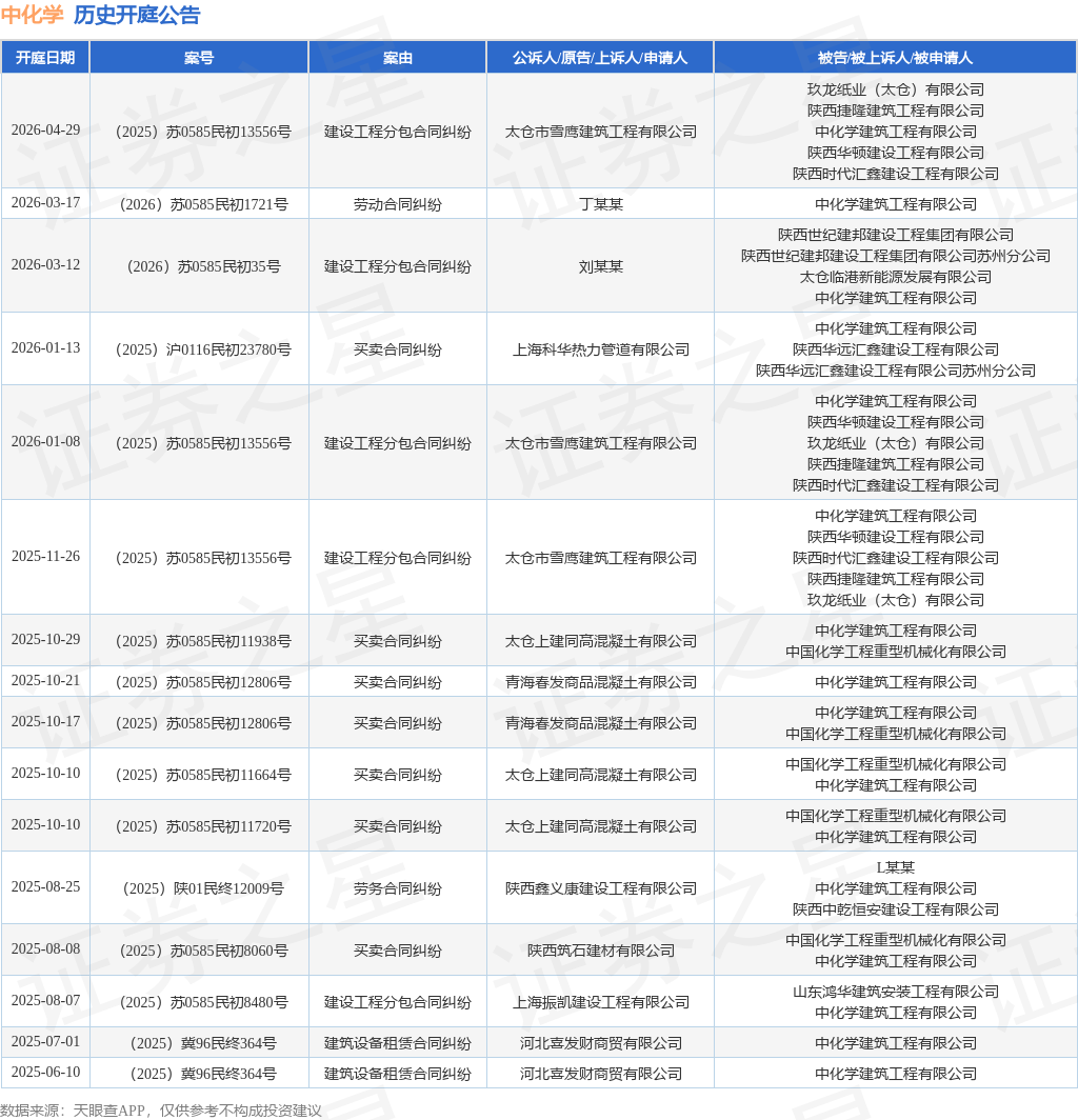 案号:(2025)苏0585民初13556号根据统计,近一年内以中化学建筑工程有限公司为当事人的历史开庭公告有16则,其中案由为“买卖合同纠纷”的公告以7则居首,其次为“建设工程分包合同纠纷”有5则,“建筑设备租赁合同纠纷”有2则。历史开庭公告如下: