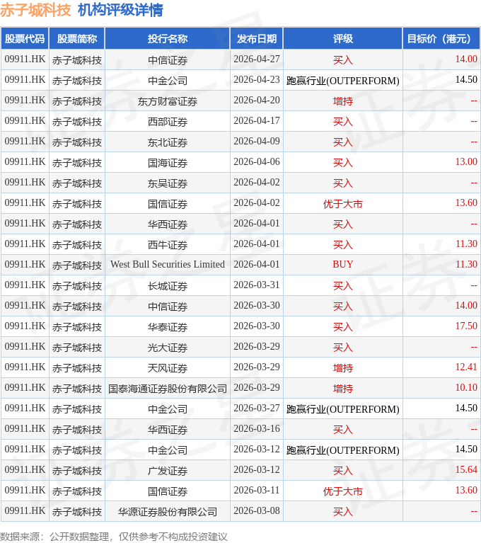 截至2026年4月28日收盘,赤子城科技(09911.HK)报收于9.38港元,下跌2.49%,成交量922.02万股,成交额8756.99万港元。投行对该股的评级以买入为主,近90天内共有14家投行给出买入评级,近90天的目标均价为13.57港元。中信证券最新一份研报给予赤子城科技买入评级,目标价14港元。