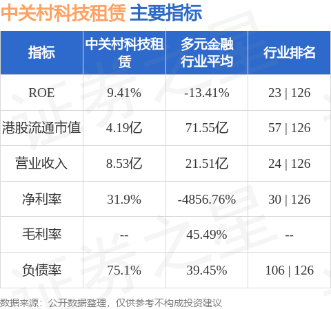 中关村科技租赁港股市值4.19亿港元,在多元金融行业中排名第57。主要指标见下表: