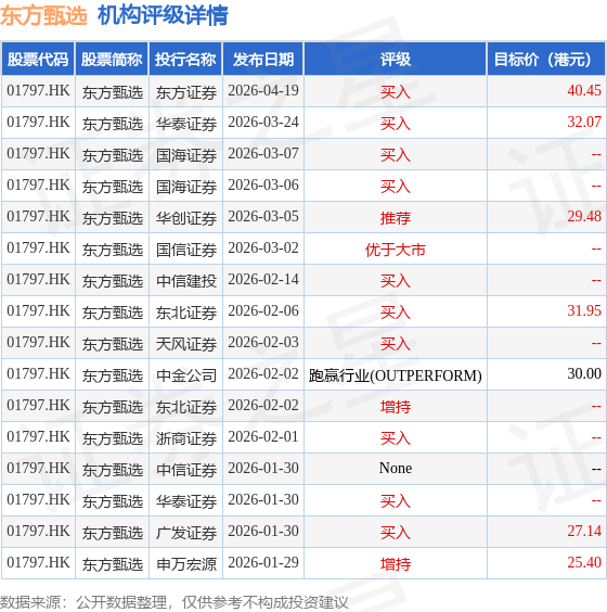 截至2026年4月28日收盘,东方甄选(01797.HK)报收于28.44港元,上涨5.88%,成交量1068.1万股,成交额2.94亿港元。投行对该股的评级以买入为主,近90天内共有10家投行给出买入评级,近90天的目标均价为30.93港元。东方证券最新一份研报给予东方甄选买入评级,目标价40.45港元。