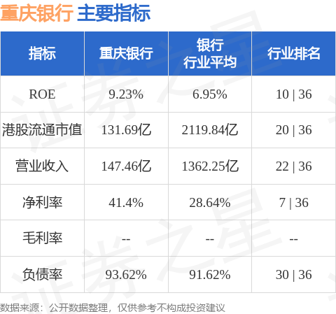 重庆银行港股市值131.69亿港元,在银行行业中排名第20。主要指标见下表:
