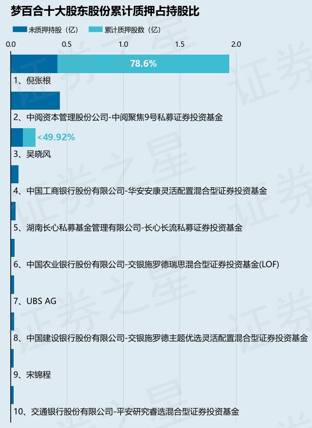 截止本公告日,股东倪张根已累计质押股份1.52亿股,占其持股总数的78.6%,股东吴晓风已累计质押股份1106.0万股,占其持股总数的49.92%。本次质押后梦百合十大股东的累计质押股份占持股比例(占持股比例的计算以公司最新一期财务报表公布的十大股东的持股总数为基准)见下图: