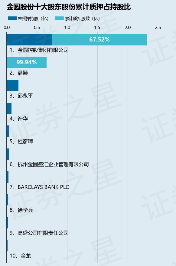 截止本公告日,股东金圆控股集团有限公司已累计质押股份1.57亿股,占其持股总数的67.52%,股东潘颖已累计质押股份6610.0万股,占其持股总数的99.94%。本次质押后金圆股份十大股东的累计质押股份占持股比例(占持股比例的计算以公司最新一期财务报表公布的十大股东的持股总数为基准)见下图: