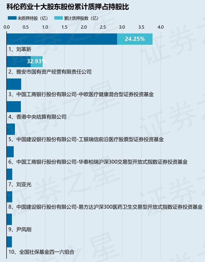 截止本公告日,股东刘革新已累计质押股份9193.7万股,占其持股总数的24.25%,股东雅安市国有资产经营有限责任公司已累计质押股份3089.0万股,占其持股总数的32.93%。本次质押后科伦药业十大股东的累计质押股份占持股比例(占持股比例的计算以公司最新一期财务报表公布的十大股东的持股总数为基准)见下图:
