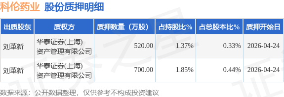 证券之星消息,科伦药业(002422)4月29日公开信息显示,股东刘革新向华泰证券(上海)资产管理有限公司合计质押1220.0万股,占总股本0.77%。质押详情见下表: