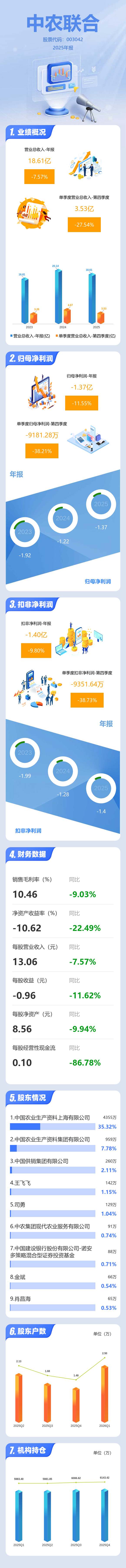 证券之星消息,中农联合2025年年报显示,当年度公司主营收入18.61亿元,同比下降7.58%;归母净利润-1.37亿元,同比下降11.56%;扣非净利润-1.4亿元,同比下降9.81%;其中2025年第四季度,公司单季度主营收入3.53亿元,同比下降27.54%;单季度归母净利润-9181.28万元,同比下降38.21%;单季度扣非净利润-9351.64万元,同比下降38.73%;负债率68.08%,投资收益1.97万元,财务费用3923.03万元,毛利率10.46%。