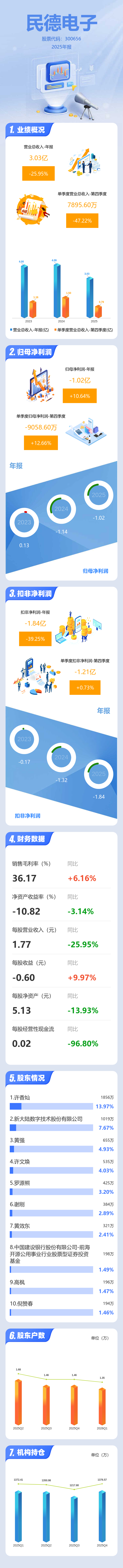 证券之星消息,民德电子2025年年报显示,当年度公司主营收入3.03亿元,同比下降25.96%;归母净利润-1.02亿元,同比上升10.65%;扣非净利润-1.84亿元,同比下降39.26%;其中2025年第四季度,公司单季度主营收入7895.6万元,同比下降47.22%;单季度归母净利润-9058.6万元,同比上升12.66%;单季度扣非净利润-1.21亿元,同比上升0.74%;负债率58.61%,投资收益2597.18万元,财务费用3486.57万元,毛利率36.16%。