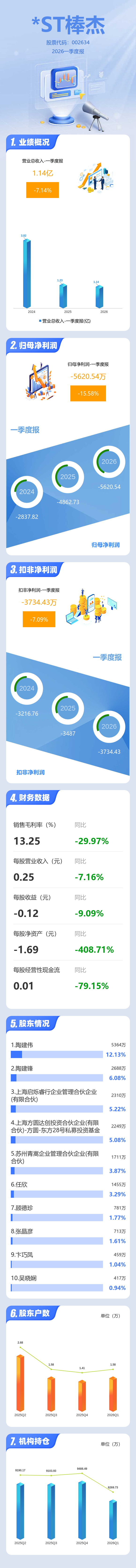证券之星消息,*ST棒杰2026年一季报显示,一季度公司主营收入1.14亿元,同比下降7.15%;归母净利润-5620.54万元,同比下降15.58%;扣非净利润-3734.43万元,同比下降7.1%;负债率147.93%,投资收益91.19万元,财务费用1969.73万元,毛利率13.25%。