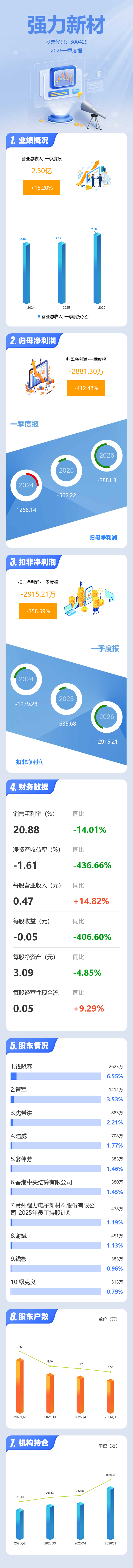 证券之星消息,强力新材2026年一季报显示,一季度公司主营收入2.5亿元,同比上升15.21%;归母净利润-2881.3万元,同比下降412.48%;扣非净利润-2915.21万元,同比下降358.6%;负债率45.04%,投资收益-13.98万元,财务费用1425.16万元,毛利率20.88%。