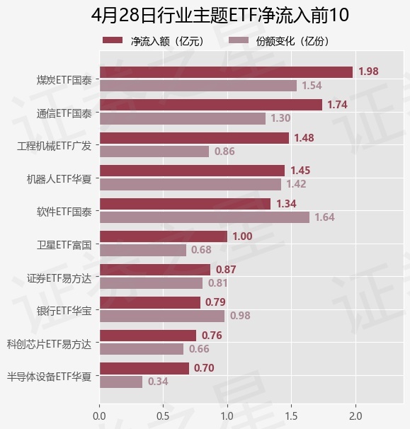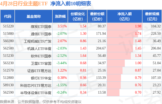 当日有110只行业主题ETF基金出现资金净流入,其中净流入排首位的是煤炭ETF国泰(515220),份额增加了1.54亿份,净流入额为1.98亿元。