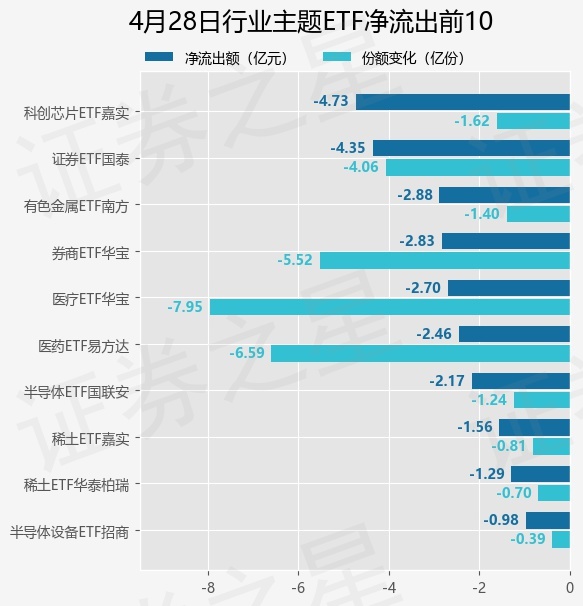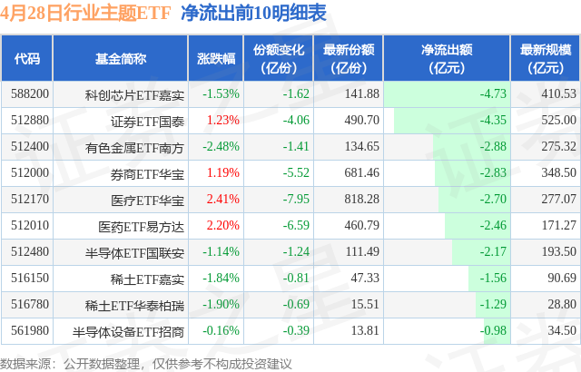 当日有130只行业主题ETF基金出现资金净流出,其中净流出排首位的是科创芯片ETF嘉实(588200),份额减少了1.62亿份,净流出额为4.73亿元。