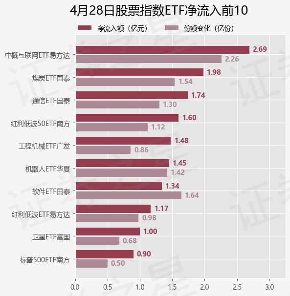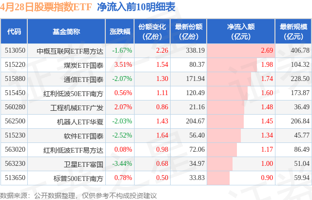 当日有181只股票指数ETF基金出现资金净流入,其中净流入排首位的是中概互联网ETF易方达(513050),份额增加了2.26亿份,净流入额为2.69亿元。