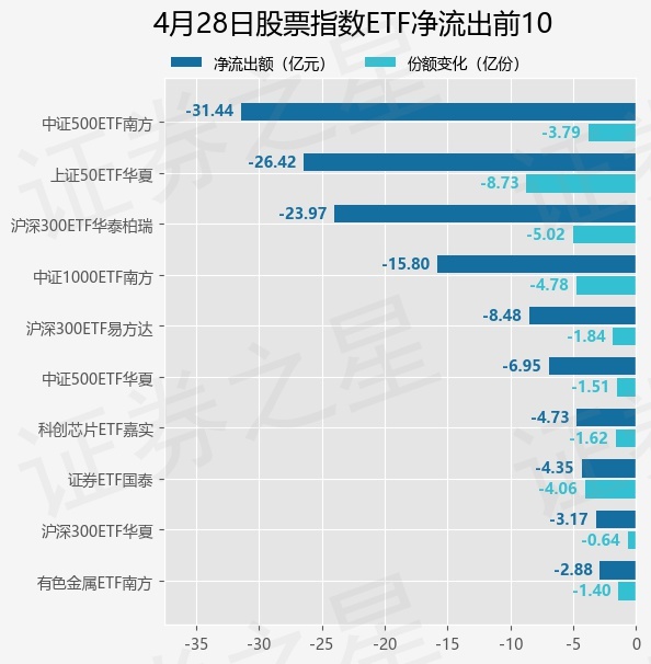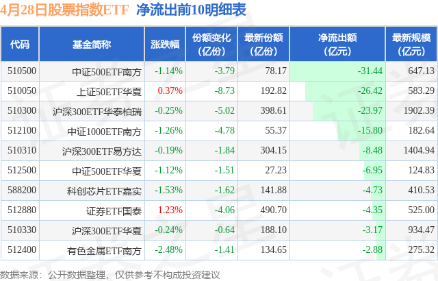 当日有242只股票指数ETF基金出现资金净流出,其中净流出排首位的是中证500ETF南方(510500),份额减少了3.79亿份,净流出额为31.44亿元。