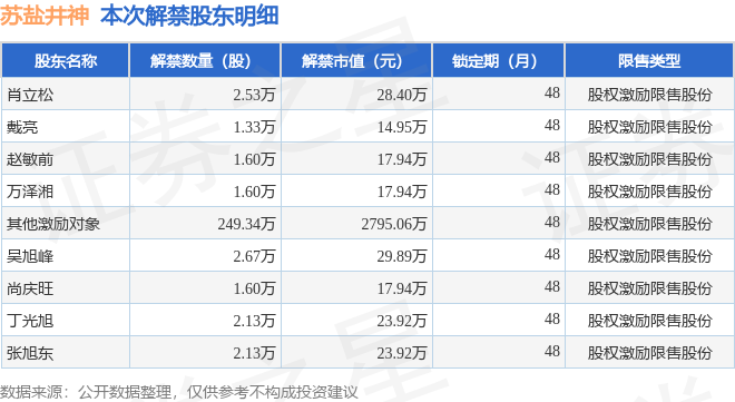 证券之星消息,根据市场公开信息整理,苏盐井神(603299)于4月29日将有264.94万股限售股份解禁,为公司股权激励限售股份,占公司总股本0.28%。(本次数据根据历史公告整理得出,实际情况以上市公司最新公告为准)最近一年内,该股累计解禁380.13万股,占总股本的0.4%。本次解禁后,公司还有1.75亿股限售股份,占总股本18.28%。具体如下图所示: