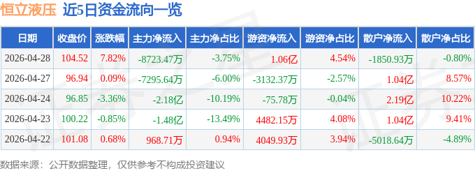 证券之星消息,截至2026年4月28日收盘,恒立液压(601100)报收于104.52元,上涨7.82%,换手率1.69%,成交量22.61万手,成交额23.27亿元。