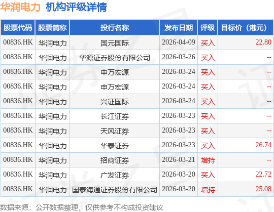 投行对该股的评级以买入为主,近90天内共有9家投行给出买入评级,近90天的目标均价为24.33港元。国元国际最新一份研报给予华润电力买入评级,目标价22.8港元。