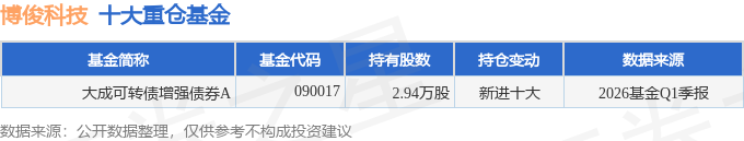 持有博俊科技最多的基金为大成可转债增强债券A,目前规模为0.85亿元,最新净值2.0475(4月28日),较上一交易日下跌1.17%,近一年上涨33.19%。该基金现任基金经理为成琦。
