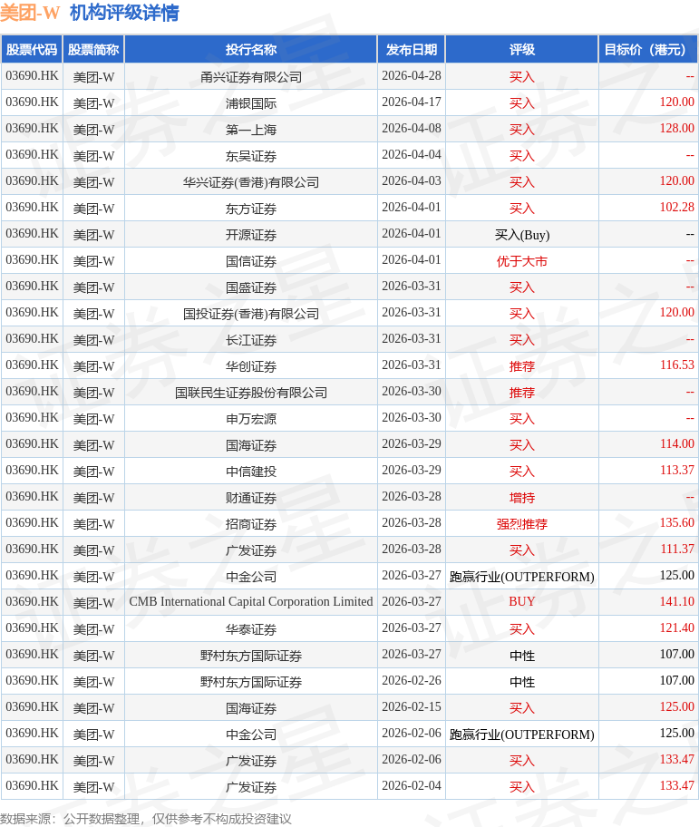 投行对该股的评级以买入为主,近90天内共有17家投行给出买入评级,近90天的目标均价为121.03港元。甬兴证券有限公司最新一份研报给予美团-W买入评级。