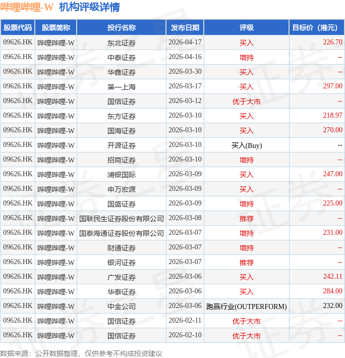 投行对该股的评级以买入为主,近90天内共有9家投行给出买入评级,近90天的目标均价为247.38港元。东北证券最新一份研报给予哔哩哔哩-W买入评级,目标价226.7港元。