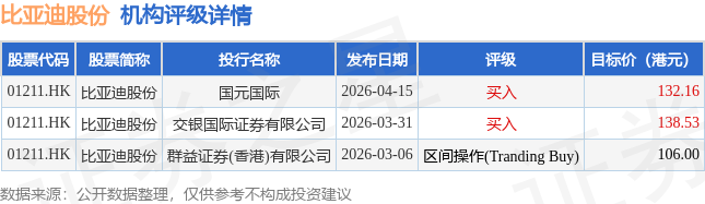 投行对该股的评级以买入为主,近90天内共有2家投行给出买入评级,近90天的目标均价为125.56港元。国元国际最新一份研报给予比亚迪股份买入评级,目标价132.16港元。